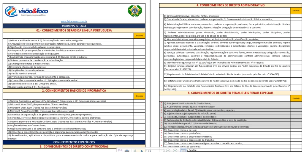 O edital verticalizado da PC RJ é uma das ferramentas preferidas aqui dos Falcões, ele te ajuda a saber tudo que será cobrado na sua prova, e a ter controle dos assuntos que já foram estudados, e dos que faltam estudar.