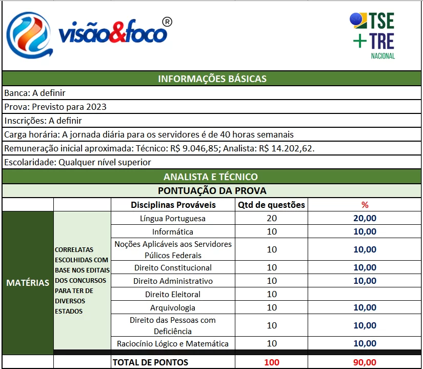 Como nunca houve um concurso dessa proporção, não há edital anterior para extrairmos informações e verticalizar o conteúdo, logo, fiz um estudo das matérias mais cobradas nos diversos estados e assim compilei o que chamo de matérias correlatas (aquelas comuns a todos os TRES do Brasil e que possivelmente cairão na sua prova).